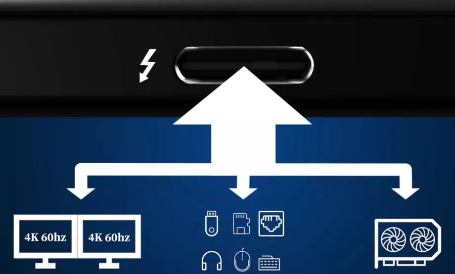 話到這里就不得不說一下雷電3協(xié)議了!雷電3協(xié)議是Intel和蘋果公司共同研發(fā),支持40Gbps帶寬和100w的供電功率。它能做的事情非常多,比如同時(shí)接2臺(tái)4K 60Hz的顯示器,搭配雷電3擴(kuò)展塢,一個(gè)小小的雷電3接口就能同時(shí)接網(wǎng)線、顯示器、鼠標(biāo)鍵盤、耳機(jī)、U盤、移動(dòng)硬盤、內(nèi)存卡等等,搭配顯卡擴(kuò)展塢還能外接高端顯卡。