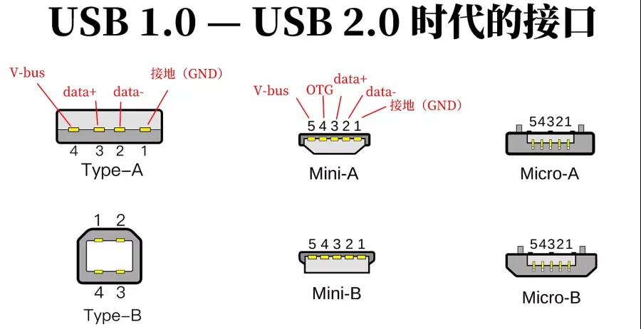 我們通常所說的USB2.0、USB3.0、雷電3、USB4等就是數(shù)據(jù)傳輸協(xié)議,它就像溝通用的語(yǔ)言,是我們看不見摸不著的東西。而各式各樣的USB接口則是我們制造出來(lái)的真實(shí)存在的東西,由多根導(dǎo)線組成,用來(lái)導(dǎo)電作為數(shù)據(jù)傳輸?shù)妮d體。在USB1.0 — USB2.0 時(shí)代,接口形狀有很多。USB2.0協(xié)議速度還是比較慢的,當(dāng)時(shí)的USB接口都是4根線的,最外面的兩根負(fù)責(zé)給鼠標(biāo)、鍵盤、手機(jī)之類的東西供電,中間兩根負(fù)責(zé)傳輸數(shù)據(jù)。其中我們最常見的是USB Type-A、Mini-B和Micro-B。